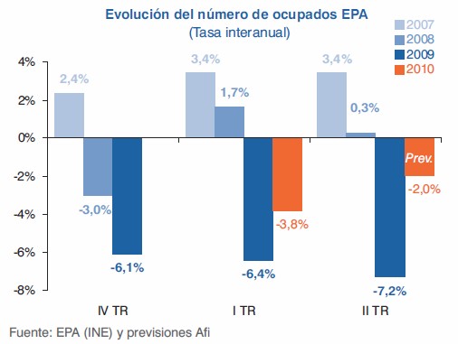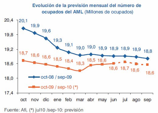 La tendencia laboral en España sigue siendo, pues, negativa. No obstante, el paro registrado en los seis primeros meses de 2010 es peor que en el mismo periodo de 2008. En el primer semestre del año el número de parados registrados aumentó en 549.000 personas respecto al mismo periodo de 2009, cuando el incremento interanual ascendió a 1,2 millones de parados. Así, la evolución del paro en 2010 es menos negativa que la de 2009, pero sigue siendo peor que la registrada en 2008.