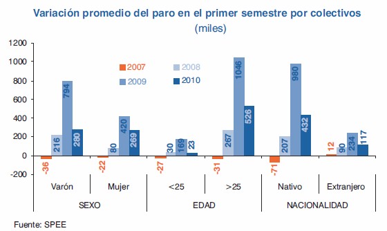 Por otro lado, el perfil de parado está cambiando con la crisis. Por colectivos, en el primer semestre de 2008, cuando la crisis prácticamente acababa de empezar, "el 73% de los nuevos parados eran varones, frente al 21% de las mujeres; un 90% eran mayores de 25 años frente al 10% de los menores de esa edad, y el 70% era nativo, frente al 30% de los extranjeros", indica el informe.