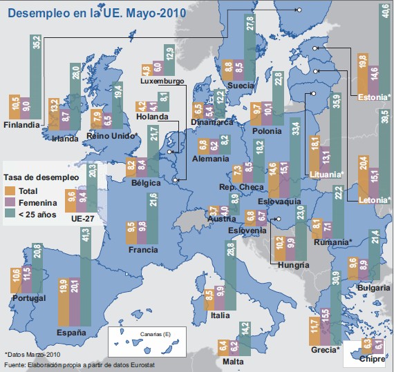 En casi toda la UE-27 la tasa de paro juvenil dobla a la media nacional. Sin embargo, la situación es mucho más grave en España y Estonia. La tasa de paro juvenil en España (41,3%) más que duplica a la media europea (20,3%), y es el único país, junto con Estonia, que supera el 40%.