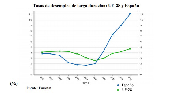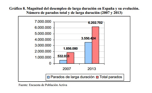 La crisis económica ha disparado el número de parados de larga duración en España. En el año 2002, esta categoría estaba en la media europea y fue en el año 2008 cuando comenzó la escalada. En 2012, la tasa de desempleo de larga duración (porcentaje de parados de larga duración sobre la población activa) superó el 11%.