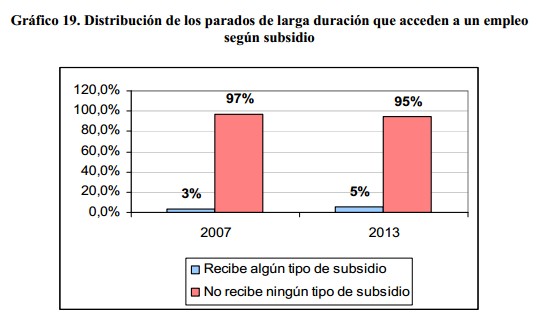 El gráfico siguiente desvela que el 95% de los parados de larga duración que encontraron un empleo el año pasado no cobraba ningún tipo de subsidio. Aunque las cifras son más que alarmantes, hay que tener en cuenta que no todos los parados que han agotado la prestación contributiva pueden acceder a la prestación asistencial ya que tienen que cumplir una serie de requisitos, como tener a cargo a algún familiar o tener más de 55 años. Por eso, dentro de los parados de larga duración, son muchos lo que no cobran ninguna ayuda y elevan ese porcentaje.