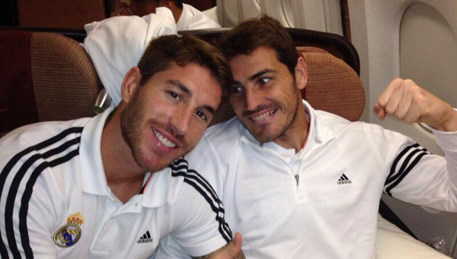 Íker Casillas y Sergio Ramos bromean en Twitter sobre la lesión del guardameta. El sevillano colgó sólo unas horas después del partido de Champions una foto en la que Iker simula darle un puñetazo, con el texto "Despegamos para casa al lado de... ejem... ejem... jejeje. Alguno me quiere matar hoy! No será nada y volverá muy pronto". Y después en inglés, algo que normalmente hace el novio de Pilar Rubio.