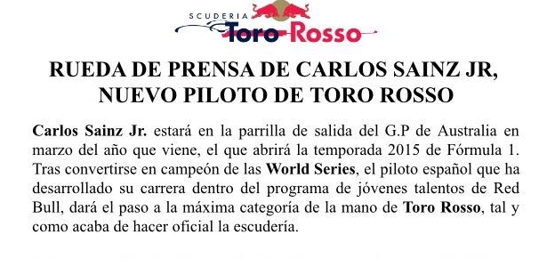 Así confirma Toro Rosso la incorporación de Carlos Sainz como piloto oficial en el siguiente comunicado: