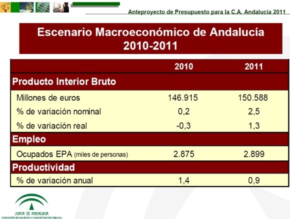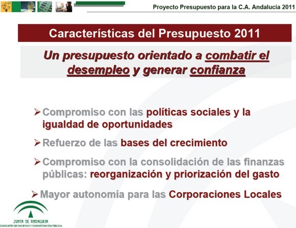 Los datos esenciales de los presupuestos para 2011, considerados por la consejera de Economía y Hacienda, y mano derecha de Griñán, Carmen Martínez Aguayo, como "el presupuesto de la recuperación", son estos: