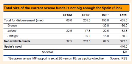Esta dificultad sería relativamente sencilla de salvar, pero no es sólo una cuestión del número de países, sino del dinero que éstos necesiten. Se supone que el agujero español es de unos 446.000 millones de euros (ver gráfico del Financial Times con datos del banco RBS).