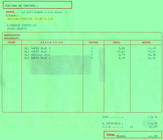 Según una factura a la que ha tenido acceso Libertad Digital, los sindicalistas de CCOO, compraron el pasado 22 de septiembre 11 tubos de Super Glue 3 y 4 de masilla gris, con un coste total de 141,55 euros.