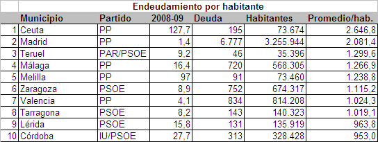 El problema del PP es que gobierna algunas de las ciudades más endeudadas de España, tanto en términos absolutos como relativos y, sobre todo, que padece los desmanes presupuestarios de Gallardón. La deuda de Madrid, Valencia, Málaga, Ceuta y Melilla, todas gobernadas desde 2007 por el PP, está fuera de control y supera en todos los casos el promedio nacional de los 958 euros por cabeza. En algunos casos lo duplica, como en Málaga, con una deuda por habitante de 1.266 euros, en otro directamente lo triplica, como en Madrid, o lo cuadruplica, como en Ceuta.
