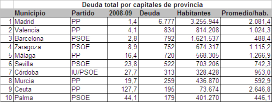 El reparto del poder municipal está muy igualado en las capitales de provincia. En 25 gobierna el PP y en 25 el PSOE, luego, Pamplona -gobernada por UPN- y Bilbao -por el PNV- van por libre. Filtrando los datos de deuda nos encontramos con que los populares son más manirrotos que los socialistas. La deuda de las capitales gobernadas por el PP es de 10.720 millones de euros, mientras que las del PSOE (ya directamente o en alianzas) deben “sólo” 3.782 millones de euros.