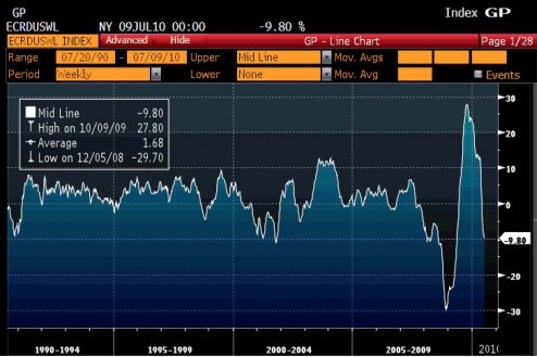 Según el analista David Rosenberg, una caída de 10 puntos porcentuales del ECRI siempre se ha traducido, posteriormente, en una recesión en los 42 años de historia que tiene este indicador, con un desfase temporal de entre tres y seis meses. De este modo, EEUU corre el riesgo de sufrir una recesión en W (double dip, en inglés).