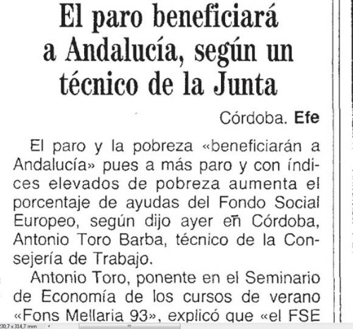 El nuevo director general del antiguo INEM, ahora Servicio Público de Empleo Estatal, dependiente el Ministerio de Trabajo e Inmigración, es el sevillano Antonio Toro Barba. Toro Barba es el mismo Toro Barba, Antonio, que siendo un técnico de la Consejería de Trabajo de la Junta de Andalucía, defendió en Córdoba en el Seminario de Economía de los cursos de verano Fons Mellaria 93 que el paro y la pobreza beneficiaban a Andalucía. Además fue uno de los principales maquilladores de las cifras de paro para Manuel Chaves. Sólo Dios sabe en manos de quién estamos.