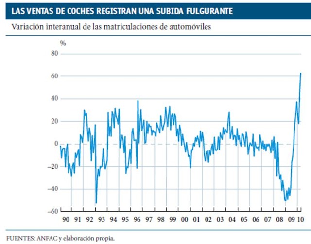 Otro caso a tener en cuenta es el experimentado por el sector del automóvil. Durante meses, la venta de coches aumentó de forma artificial en España gracias a la concesión de subvenciones públicas (Plan 2000E).