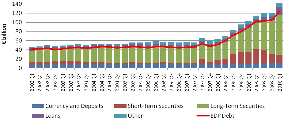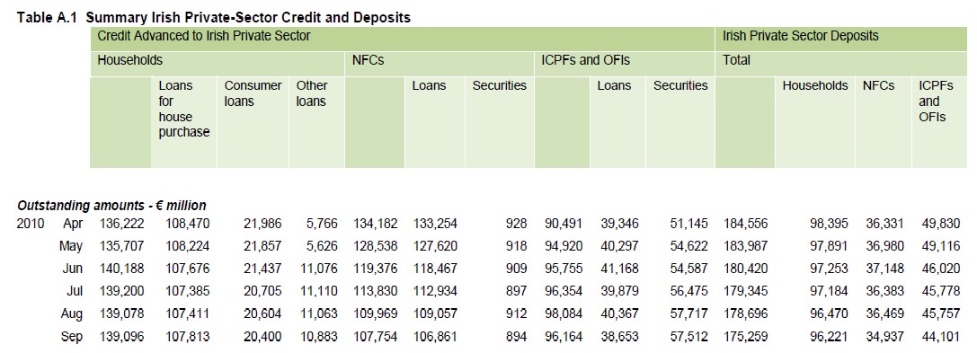 El sector privado acumula una deuda próxima a los 350.000 millones de euros (175% del PIB). Tan sólo la deuda hipotecaria asciende a 110.000 millones. Sin embargo, tras el estallido de la burbuja, la depreciación de activos y la morosidad se han materializado en enormes pérdidas para el sector bancario irlandés. Dublín estima que tendrá que inyectar cerca de 50.000 millones de euros extra para rescatar a su banca. Las ayudas prestadas hasta ahora al sistema han disparado el déficit público irlandés hasta el 32% del PIB en 2010.