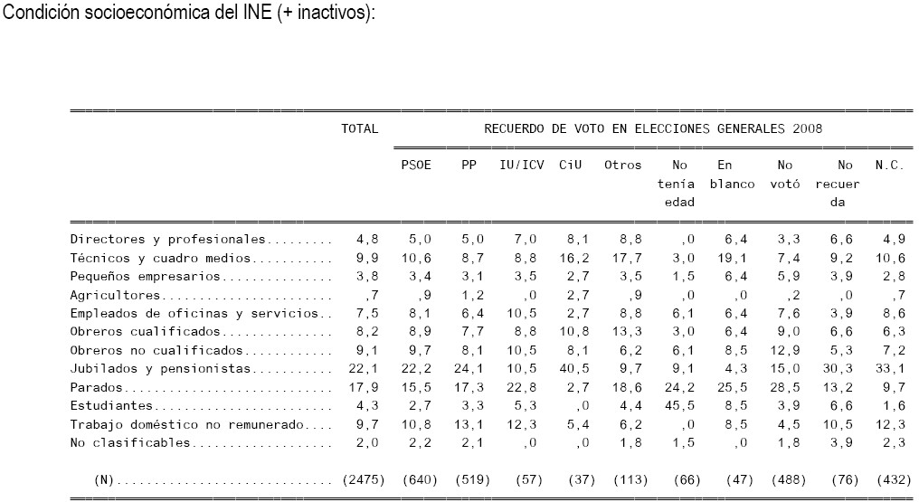 Para elaborar su encuesta, el Centro de Investigaciones Sociológicas ha tomado una muestra de 2.475 personas, representativa de la población española. En esta muestra, el 56% no trabaja, dividiéndose entre el 22,1% de jubilados y pensionistas, el 17,9% de parados, el 4,3% de estudiantes, el trabajado doméstico no remunerado (amas de casa) 9,7%. Aunque tales datos no son extrapolables, la encuesta del CIS muestra una particular reflejo sobre la soceidad española.