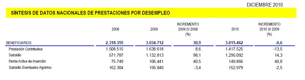 Los datos que ofrece el departamento de Valeriano Gómez señalan que en diciembre de 2010, a cierre de año, recibían prestaciones por desempleo 3.015.462 parados. Teniendo en cuenta que en aquel mes el número de parados registrados, una vez eliminado el maquillaje estadístico al que nos tiene acostumbrado el Gobierno, ascendía a 4.548.415 desempleados. Así, a cierre de 2010, España soportaba un total de 1.532.953 parados sin prestación.