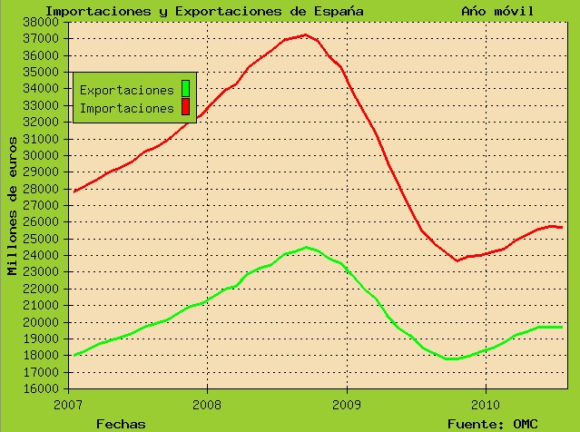 Las exportaciones parecen haberse estabilizado en un nivel aproximadamente un 20% inferior al del máximo de 2008, algo que no se observa en el caso de Alemania, la cual, si bien todavía se encuentra lejos de sus máximos de 2008, sigue aumentando sus exportaciones (+6.6% en julio respecto a julio de 2009).