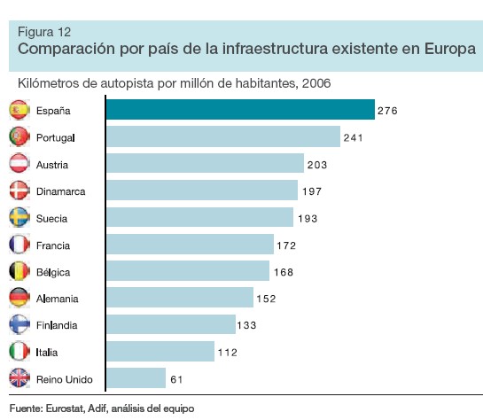 2. Autopistas, los primeros de Europa: en transporte por carretera, la explosión del gasto en infraestructuras se nota, por ejemplo, en el número de autopistas. España es el primer país de Europa en este ranking, si se mide en términos de kilómetros por habitante (ver gráfico). Además, en nuestro país la mayoría de estas carreteras son autovías gratuitas frente a otros países en los que la norma es el peaje: menos electoral, pero más sostenible económicamente.