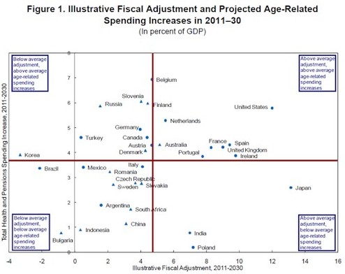 En el informe del FMI, tal y como explica Vicente Esteve en su blog, se muestra un gráfico en forma de eje de ordenadas en la que se distribuyen los países en base a dos parámetros: el ajuste fiscal necesario en términos de reducción del saldo primario (necesidad de reducción del gasto público o incremento de los ingresos respecto de la situación actual) y el aumento previsto relacionado con el envejecimiento de la población.