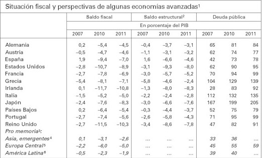 Pues bien, sólo hay que mirar el cuadro para darse cuenta de que España está en una de las peores situaciones posibles: un nivel de déficit que hace necesario un fuerte ajuste fiscal (el FMI lo cuantifica en un 9,2% del PIB), unido a unas perspectivas de envejecimiento poblacional (4,3% de incremento de aquí a 2030) que harán mucho más difícil este ajuste. Sólo EEUU está en una situación claramente más desventajosa, y tan sólo Irlanda y el Reino Unido, entre los países de la UE, se acercan a la posición española.