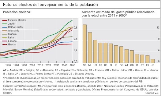 Y para terminar, se hace hincapié en las malas perspectivas para las próximas dos o tres décadas asociadas al envejecimiento de la población. España será uno de los países en los que más van a crecer las clases pasivas (jubilados y otros pensionistas) y en el que menos van a aumentar los cotizantes (en parte por una cuestión demográfica y en parte por la rigidez del mercado laboral).