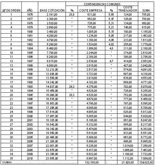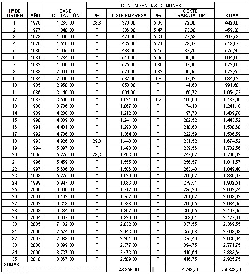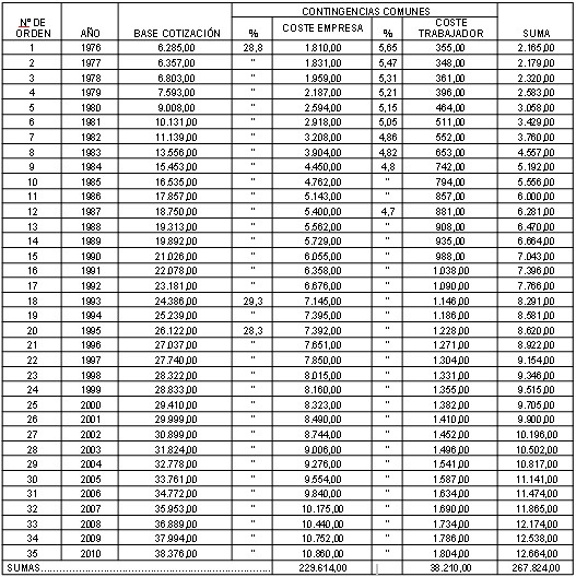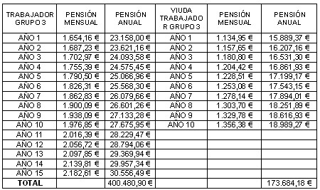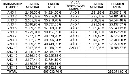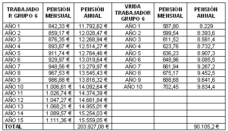 Ese trabajador, jefe administrativo, cotizando por la base media durante 35 años percibiría por jubilación 400.480,90 euros, y su esposa por viudedad 173.684,18. Es decir, un total de 574.165,08 euros.