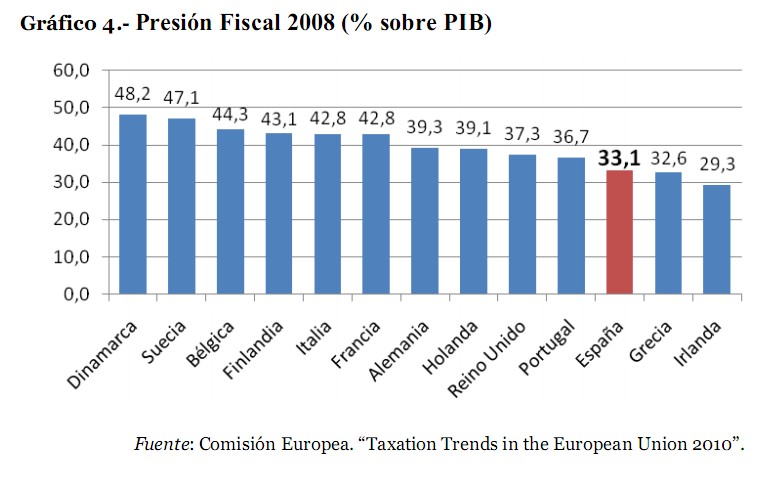 Sin embargo, según las conclusiones de este estudio, lo que es baja en España es la recaudación, no los tipos impositivos. Normalmente, la presión fiscal es la ratio más utilizada para medir el nivel de los impuestos en un país. Este dato se obtiene dividiendo el montante total recaudado entre el PIB total de un país. En España, la presión fiscal en 2009 se situó en el 30%, un porcentaje bastante bajo en relación con el de otros países de la UE (Dinamarca, por ejemplo, está en el 48%).
