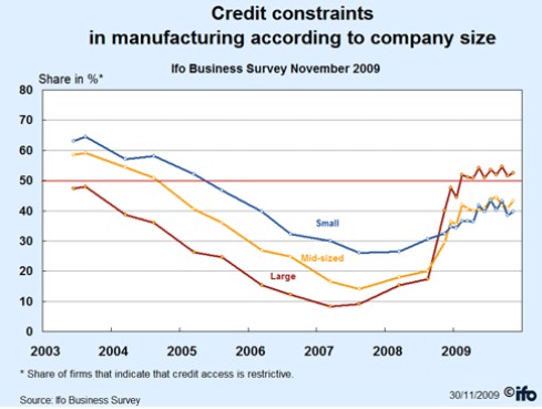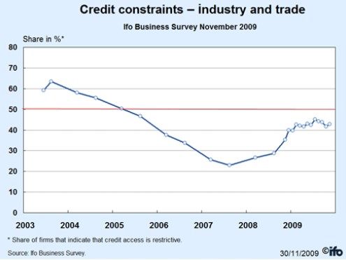 En el último informe mensual del Bundesbank correspondiente a noviembre (Monthly Report November 2009), señalaban cómo “las instituciones crediticias domésticas redujeron su nivel total neto de préstamos en el tercer trimestre, principalmente en respuesta a un ambiente económico débil y una baja utilización de la capacidad, y debido en menor parte a un generalizado endurecimiento en la oferta de los estándares crediticios por parte de los bancos” (página 9).