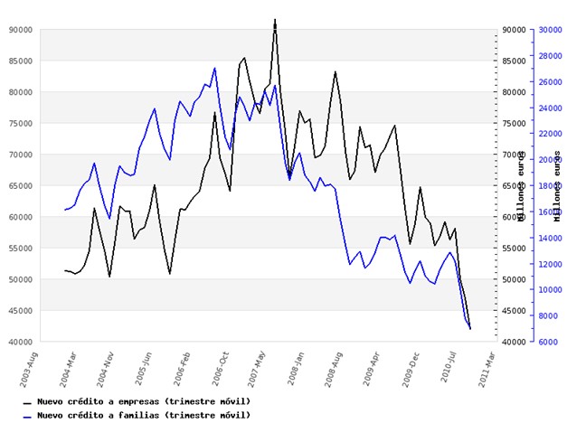 Vemos en el gráfico lo que ha ocurrido con el crédito desde 2004. Como se puede apreciar, el nuevo crédito a familias alcanzó su máximo a mediados de 2006, mientras que el correspondiente a empresas siguió aumentando justo hasta que estalló la crisis de las subprime (hipotecas basura), a mediados de 2007. Desde entonces, el declive ha sido constante y esta caída ha tomado nuevo impulso desde la crisis de la deuda pública el pasado mayo.