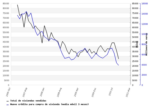 Las últimas caídas en el nuevo crédito para la compra de vivienda hacen imposible que este stock se vaya liquidando. En el gráfico podemos apreciar cómo el nuevo crédito hipotecario y la venta de pisos van de la mano, como por otra parte es lógico. Esto impulsará nuevas caídas en los precios, algo que ya se aprecia en los últimos datos estadísticos.