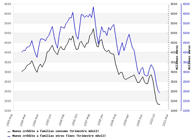 - "El crédito a las familias mantiene su lenta recuperación gracias a las hipotecas". El País, 7/12/2010.