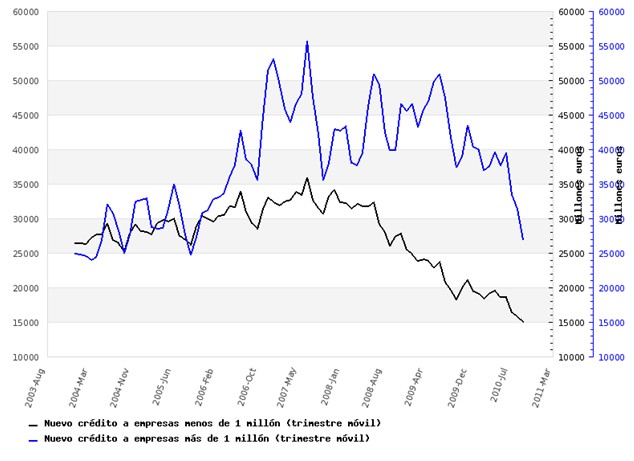 Los datos de la evolución del crédito a empresas son demoledores y muestran un virtual colapso del crédito a la pequeña empresa y, últimamente, también a la gran empresa.