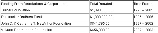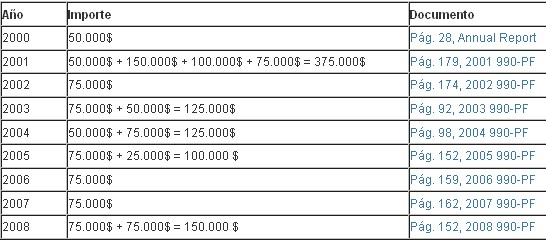 Sin embargo, dicho lema no incluye los generosos donativos que habitualmente recibe de grandes fundaciones y organismos sin ánimo de lucro que, curiosamente, pertenecen a grandes familias y magnates vinculados al petróleo, la banca, los medios de comunicación e, incluso, la automoción.
