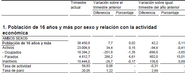 Finalmente, la Encuesta Población Activa (EPA) del primer trimestre de 2010 publicada este viernes indica que el desempleo aumenta en 286.200 personas este trimestre. El número total de parados se sitúa en 4.612.700, con un aumento de 602.000 en los últimos 12 meses. La tasa de paro aumenta 1,22 puntos en el primer trimestre del año y se sitúa en el 20,05% de la población activa. Con esta cifra, la tasa de desempleo alcanza su nivel más alto de la serie histórica comparable, que arranca en 2001.