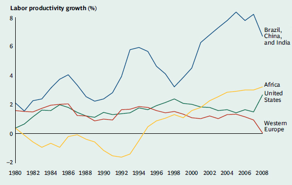 Uno de los problemas tradicionales de África era la baja cualificación y poca fiabilidad del factor trabajo. Eso también está cambiando. Desde mediados de los años 90 la productividad del trabajo ha crecido sustancialmente en el continente negro, tal y como se ve en la siguiente gráfica: