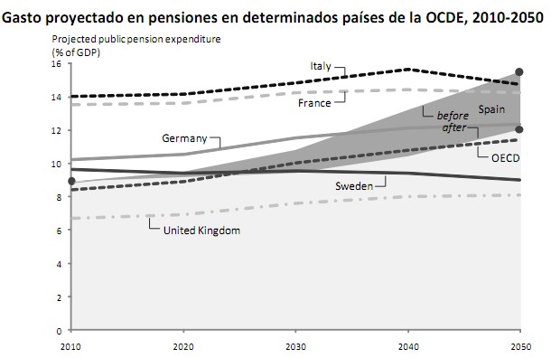 Este jueves los ha confirmado la OCDE. En su informe, la organización admite que la reforma aprobada este año recortará las pensiones una media del 9% (pasarán a suponer un 81,2% del salario medio al 73,9%), sino que además, estarán sometidas a una rebaja continua, según vaya aumentando la esperanza de vida de los jubilados españoles y caiga el ratio entre número de trabajadores y empleados.