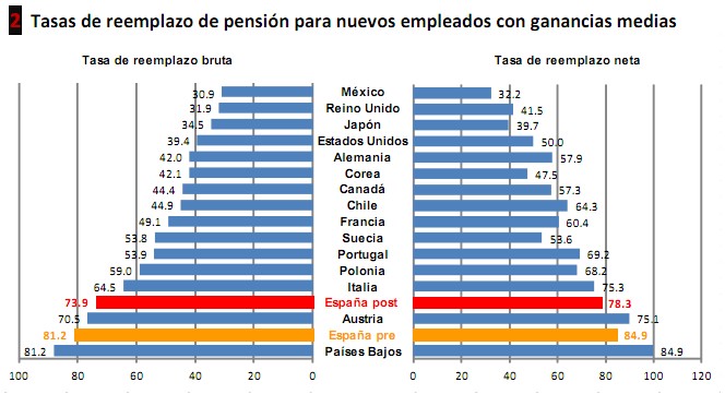 La OCDE señala que la tasa simulada de reemplazo, que es la que mide la pensión en relación con los ingresos salariales, es actualmente mucho más reducida en los 34 países que componen la organización (57,3%) que en España (81,2%).