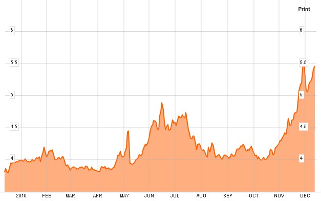 En concreto, la rentabilidad (tipo de interés) del bono español a diez años se situaba en el 5,57% frente al 2,99% ofrecido por los bonos alemanes, muy cerca del máximo histórico desde la introducción del euro alcanzado el pasado noviembre (5,67%).Por su parte, los bonos españoles a tres años ofrecían una rentabilidad del 4,11%, frente al 1,25% ofrecido por sus homólogos germanos.