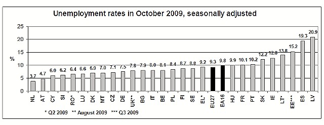 La oficina de estadísticas indicó que la tasa de paro masculina entre octubre de 2008 y octubre de 2009 aumentó en la zona euro hasta el 9,7%, desde el 7,3%, mientras que en el caso de las mujeres el paro alcanzó el 10%, frente al 8,5% de hace un año. Asimismo, el desempleo juvenil subió hasta el 20,6%, en contraste con la tasa del 16,2% de hace un año.