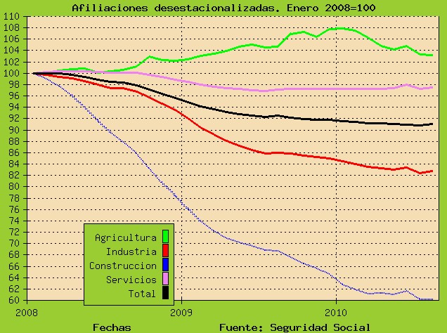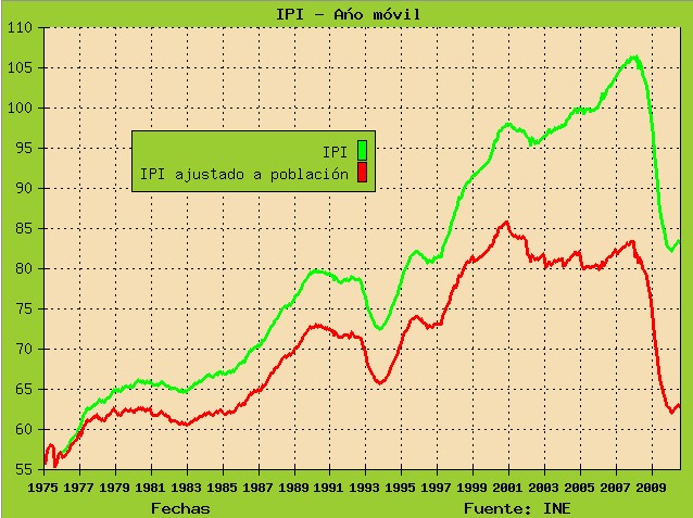 Resulta, igualmente, llamativo que aunque el IPI ha caído un 21,6%, el empleo industrial lo ha hecho menos, lo cual contradice claramente las estadísticas que hablan de aumento de la productividad. En el sector servicios la contradicción es aún mayor (datos para analizar detalladamente en otro momento).