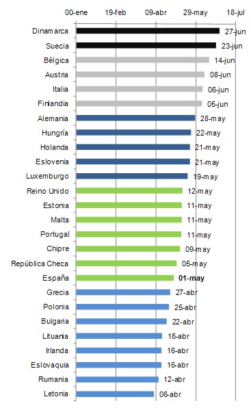 Pero no se queda aquí este estudio. También compara la situación española con la del resto de países de la UE, y concluye que la liberación fiscal llega en España relativamente antes que en el resto de miembros.