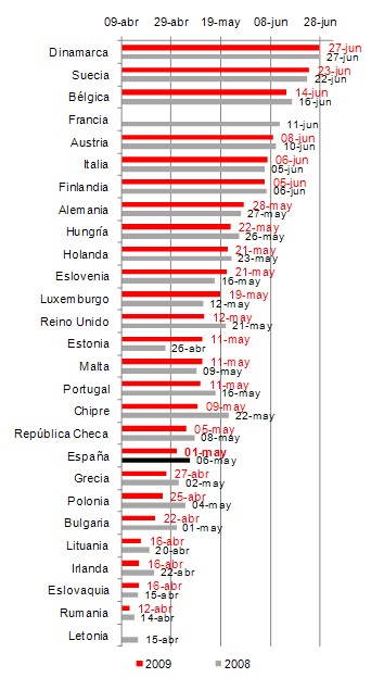 España ha registrado en el último año una reducción de la presión fiscal moderada, en comparación con los países de la UE, de modo que la liberación fiscal llega 5 días antes que en el 2008. Los contribuyentes de Lituania, República Checa, Hungría, Holanda y Bélgica trabajaron entre 2 y 5 días menos en 2009 para cumplir con sus obligaciones tributarias.