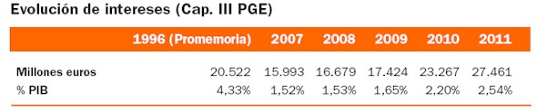 Pero es que incluso si se toman como buenas las cifras del Gobierno, los autores del informe alertan de la peligrosidad del terreno en el que están entrando las cuentas públicas españolas. Así, los intereses de la deuda, que en 2007 suponían unos 16.000 millones de euros, ahora se comerán más de 27.000 millones (por encima del 2,5% del PIB).