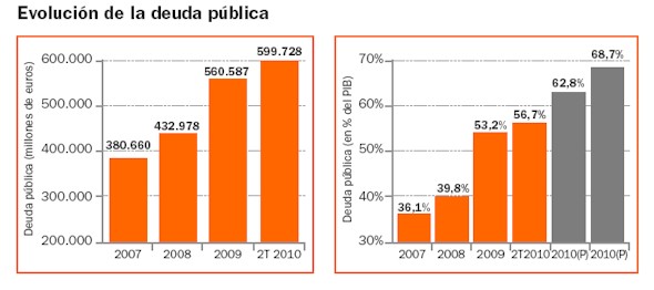 Algo normal, por otra parte, cuando se analizan los cuadros con los que se ilustra la portada del documento y que muestran como en el segundo trimestre del 2010 la deuda ya rozaba los 600.000 millones, un 62,8% del PIB. Esta cantidad es un 57% superior a la que había hace sólo 3 años. De esta manera, incluso si se cumplen los objetivos del Gobierno (que los autores consideran optimistas) el Tesoro acabará 2011 debiendo una cantidad cercana al 70% del PIB español.