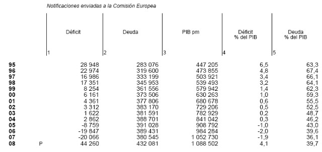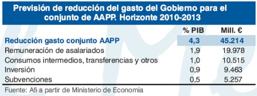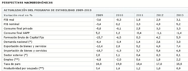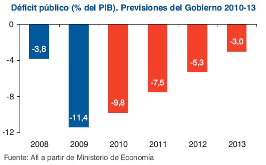 Economía ha defendido que su plan de austeridad pública, que incluye un recorte del gasto próximo a los 50.000 millones de euros en tres años, y la recuperación económica lograrán reducir el déficit público desde el 11,5% del PIB en 2009 hasta el 3% en 2013, el límite máximo que marca la UE. Esto supondría un ajuste de 8,5 puntos porcentuales (algo más de 85.000 millones de euros) en un plazo de tres años.