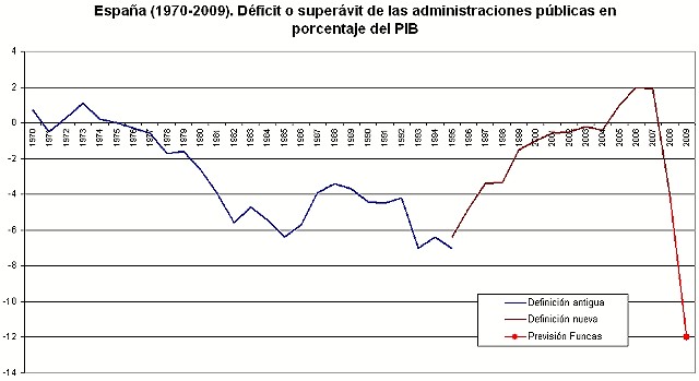 De hecho, Ángel Laborda, director del Gabinete de Coyuntura y Estadística de la Fundación de las Cajas de Ahorros (Funcas), afirmó recientemente que el déficit público en 2009 y 2010 se situaría probablemente en el 12% del PIB. En la actualidad, España cuenta con el mayor desequilibrio fiscal de su historia reciente, según datos oficiales recogidos desde 1970.