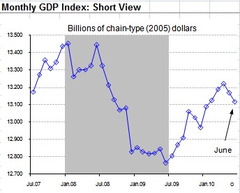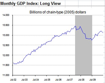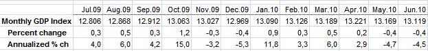 En este sentido, David Rosenberg, ex economista jefe de Merrill Lynch y actual estratega de Gluskin Sheff & Associates, afirmó el pasado viernes que "nuestras sospechas se han confirmado: la recesión nunca ha acabado. Los datos mensuales de Macroeconomic Advisers indican que el PIB real de EEUU alcanzó su pico el pasado abril y, como esperábamos, bajó un 0,4% en mayo y junio". Según estos datos, EEUU habría crecido un 2,9% anual en abril, para luego caer un 4,7% y un 4,5%, respectivamente.
