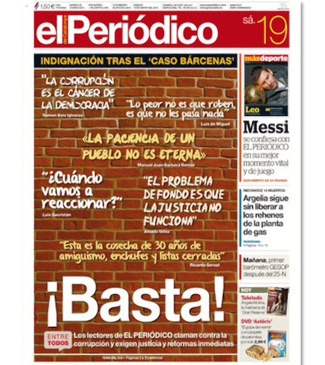Para colmo, y después de este clamoroso silencio, El Periódico elaboraba una portada el pasado sábado, después de conocerse, otra vez a través de El Mundo –que súbitamente ha dejado de ser anticatalán y ha recuperado la credibilidad– el escándalo Bárcenas, en la que simulaba un muro en el que se leía "Basta" y decía recoger la "indignación ciudadana" por la corrupción.