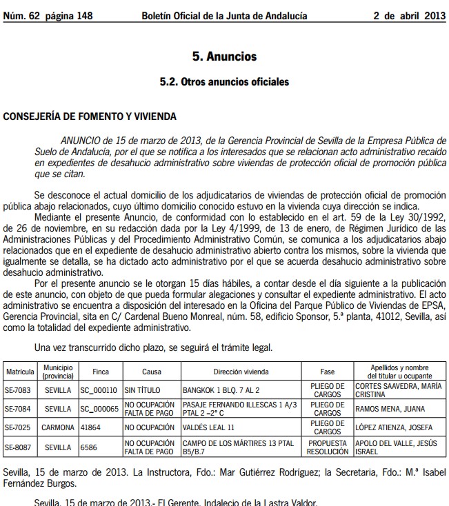 - Anuncio de 23 de enero de 2013, de la Empresa Pública de Suelo de Andalucía, por el que se notifica resolución en expediente de desahucio administrativo.Organismo: Consejería de Fomento y Vivienda (Boletín número 26 de 06/02/2013 Sección: Anuncios)