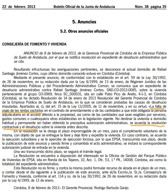 - Anuncio de 8 de febrero de 2013, de la Gerencia Provincial de Córdoba de la Empresa Pública de Suelo de Andalucía, por el que se notifica resolución en expediente de desahucio administrativo que se cita.Organismo: Consejería de Fomento y Vivienda (Boletín número 38 de 22/02/2013 Sección: Anuncios)