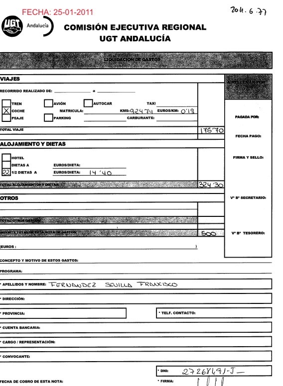 La falsificación se deduce del hecho de que es absolutamente imposible que, al menos durante un año y medio, esto es, 18 meses consecutivos, el entonces secretario de Organización de UGT Andalucía y hoy líder máximo, realizara los mismos kilómetros, incluso los mismos hectómetros y decámetros, en su actividad sindical, todos los meses.