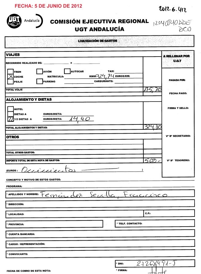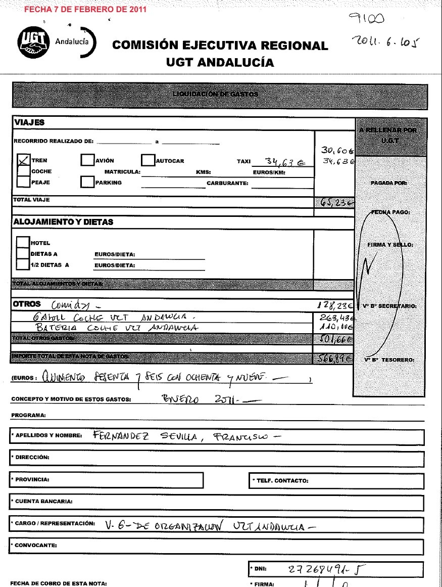 Francisco Fernández Sevilla, secretario general de UGT Andalucía recién elegido en el pasado X congreso regional del mes de mayo de este año, falseó todos los gastos que ha presentado al cobro en la caja de la organización sindical desde enero de 2011 hasta, al menos, junio de 2012 según la documentación que obra en poder de Libertad Digital.
